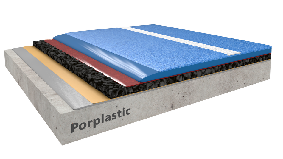 Tennis court flooring system for indoor and outdoor point-elastic according to DIN V 18032-2 and EN 14904, ITF classified